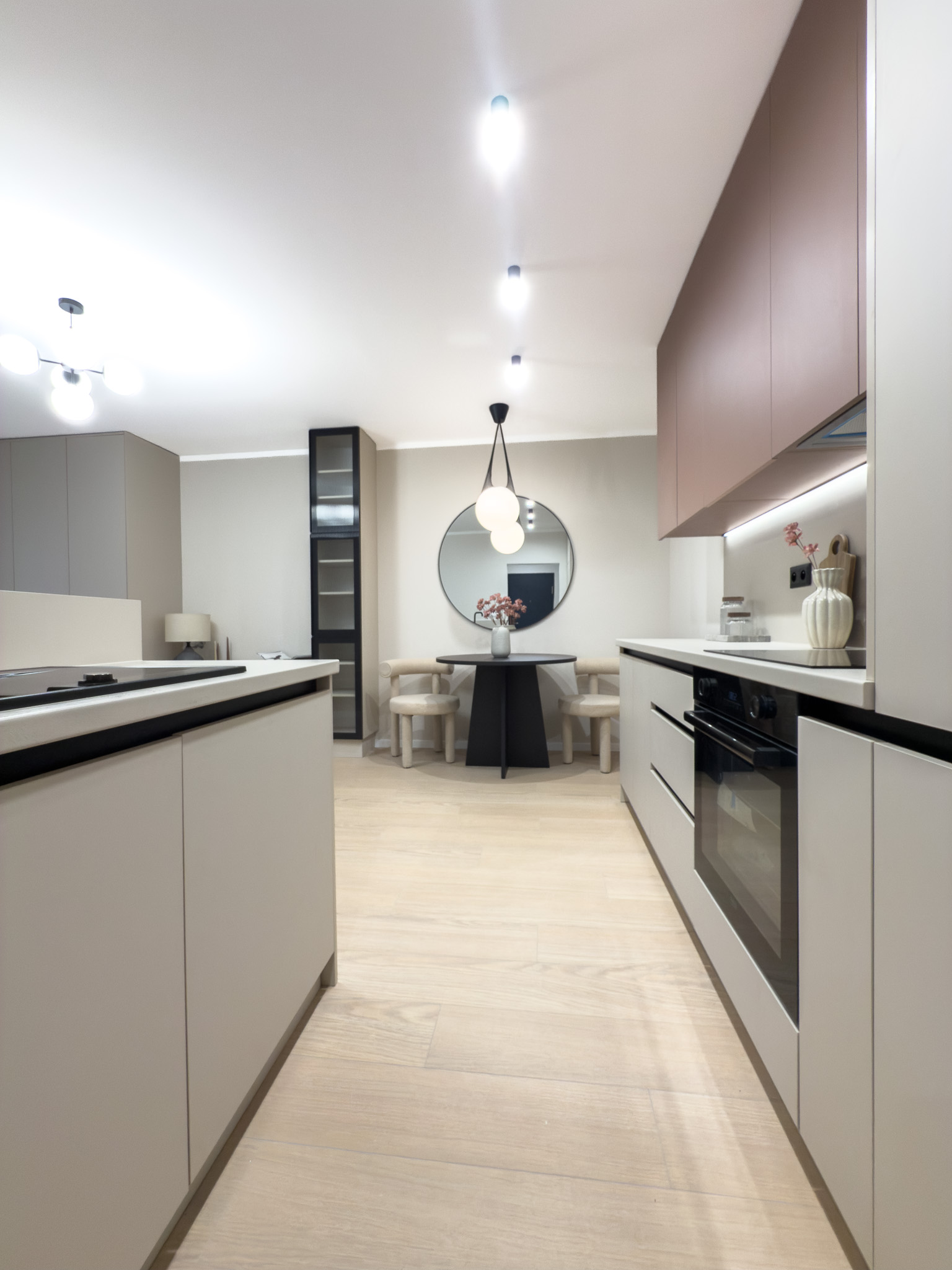 Dispozičné riešenie bytu je navrhnuté tak, aby maximalizovalo priestor a komfort bývania. Vstupná chodba je vybavená veľkým vstavaným šatníkom, ktorý poskytuje dostatok úložného priestoru. Hlavná obytná miestnosť je funkčne prepojená s kuchyňou, pričom jednotlivé zóny sú opticky oddelené moderným kuchynským ostrovom. Kuchynská linka je vybavená všetkými potrebnými spotrebičmi - chladnička, elektrická sklokeramická varná doska, teplovzdušná rúra, digestor a umývačku riadu. Pohodlná pohovka s modernými koameninovými stolíkmi dotvárajú atmosféru štýlového bývania. V spálni je manželská posteľ, estetický toaletný stolík so zrkadlom a nástenné skrinky. Kúpeľňa je spojená s WC a je vybavená vaňou, ktorá umožňuje relax po dlhom dni ako aj množstvom úložného priestoru v skrinke pod umývadlom a nad WC. Veľká loggia predstavuje príjemné rozšírenie obytného priestoru, ideálne na rannú kávu, oddych po práci alebo letné posedenie. K bytu navyše prislúcha praktická pivnica, čo zvyšuje komfort bývania. Všetok nábytok v byte je vyrobený na mieru a v jednotlivých miestnostiach je materiálovo, ako aj štýlovo prepojený, pričom ponúka maximálne množstvo úložného priestoru.