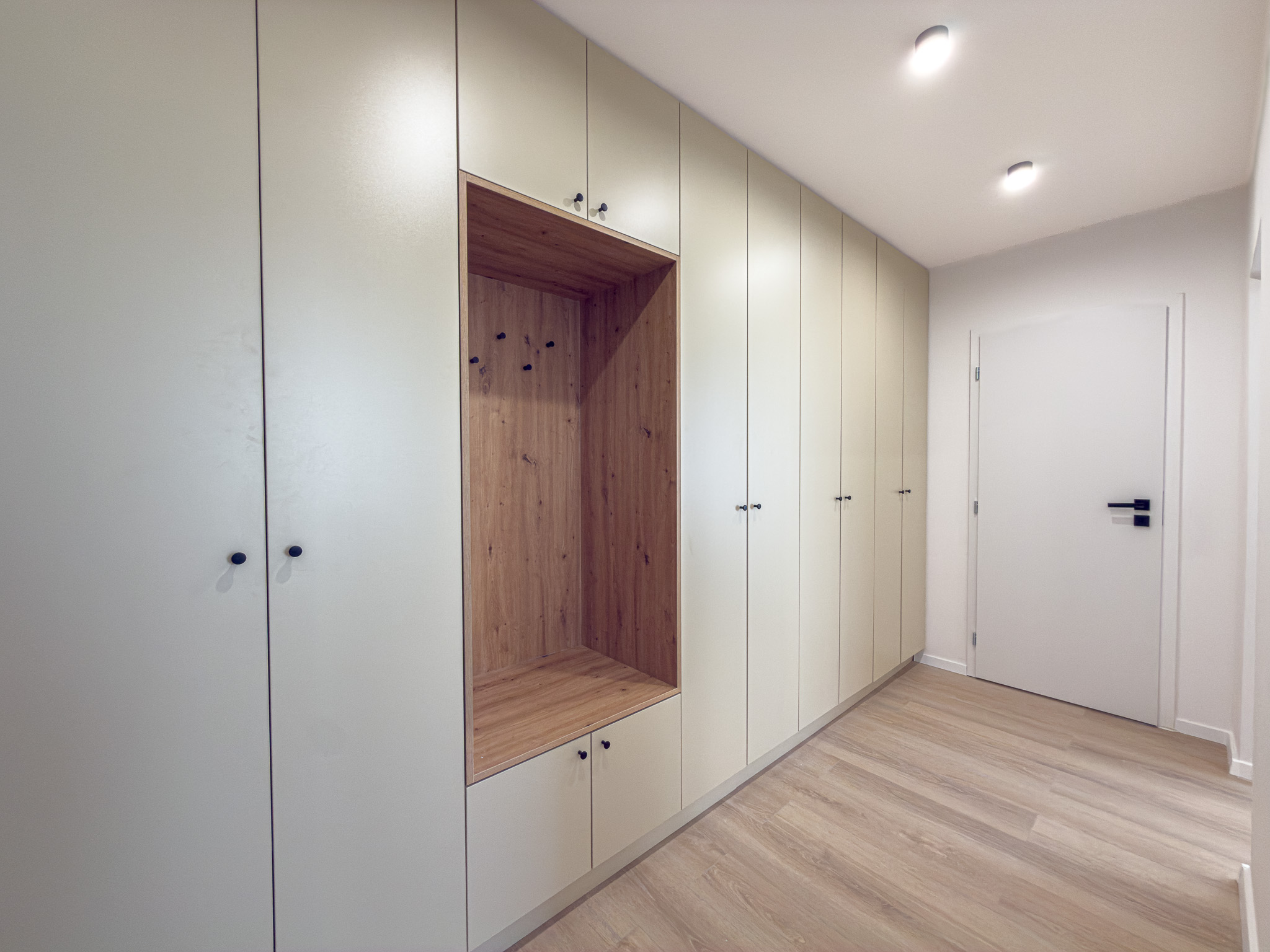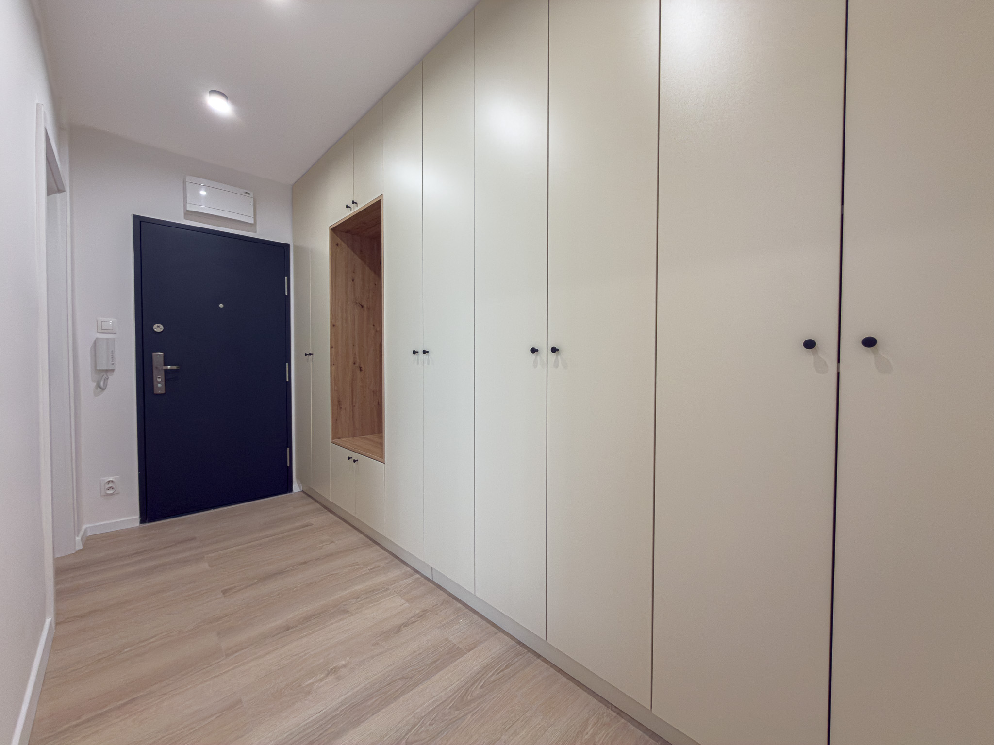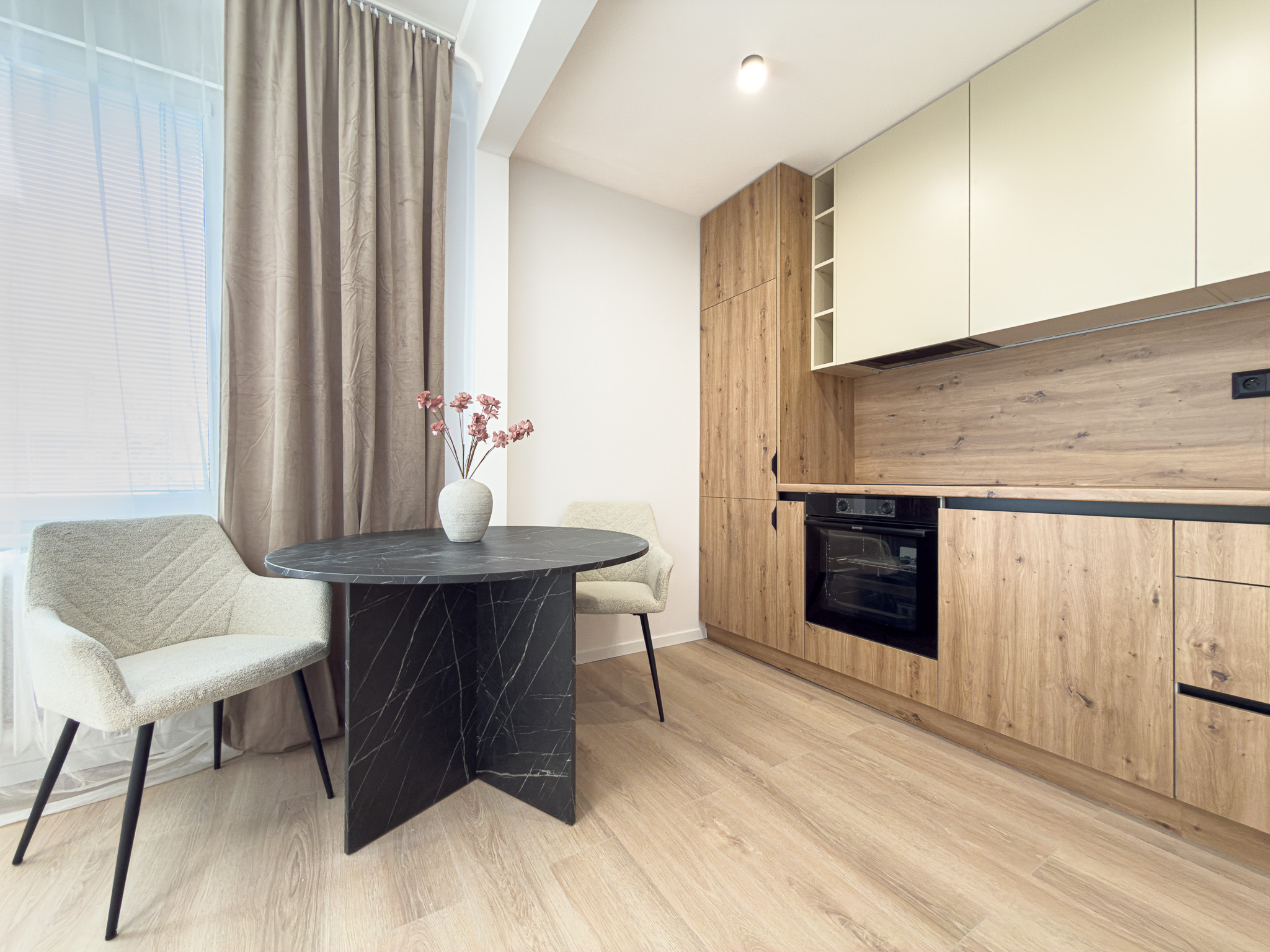 Dispozične byt pozostáva zo vstupnej chodby, obývacej izby prepojenej s kuchyňou, samostatnej spálne a kúpeľne spojenej s WC. V chodbe sa nachádza veľká šatníková skriňa, ktorá poskytuje dostatok úložného priestoru. Kuchyňa je vybavená kuchynskou linkou so všetkými potrebnými spotrebičmi, jedálenským stolom so stoličkami a plynulo nadväzuje na obývaciu časť so sedačkou a modernou TV stenou. Spálňa disponuje manželskou posteľou a nástennou skrinkou.