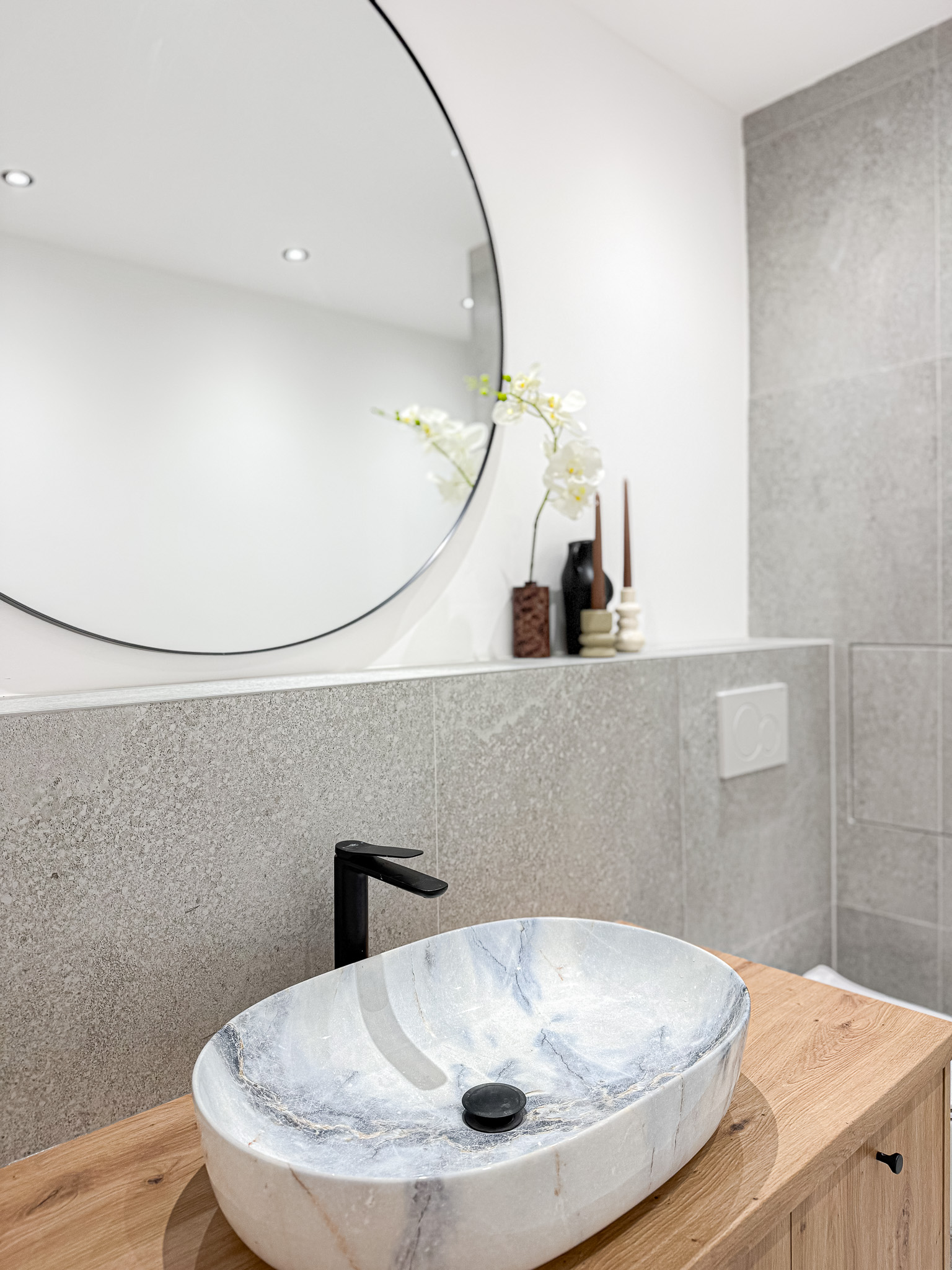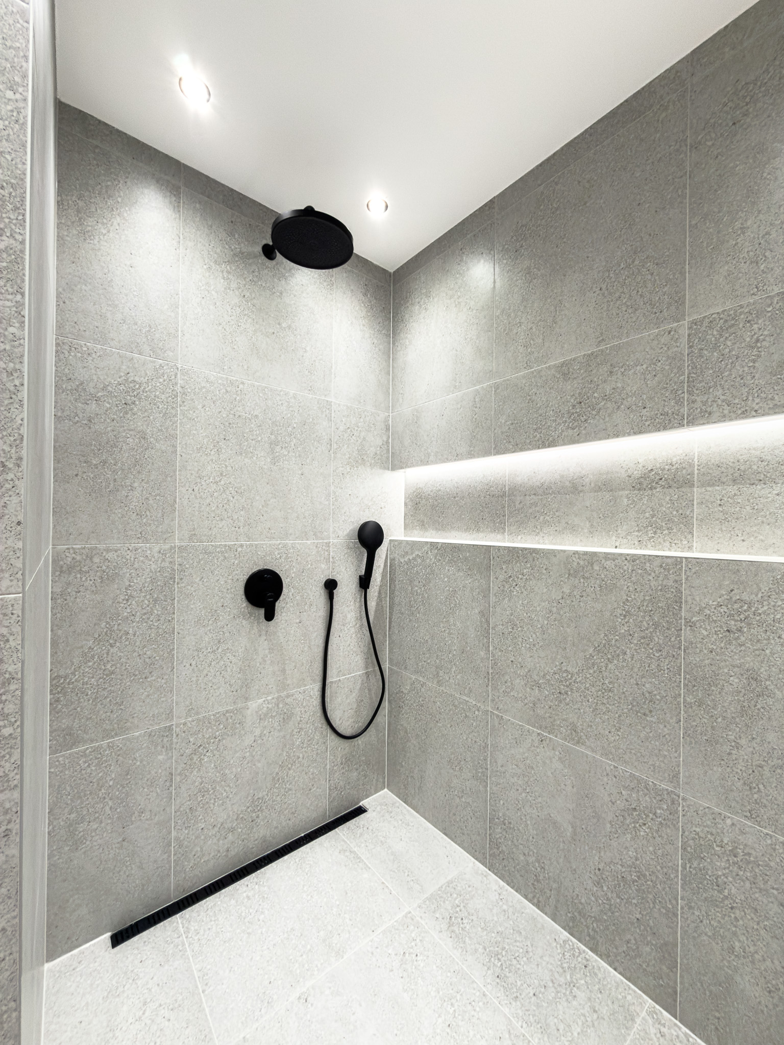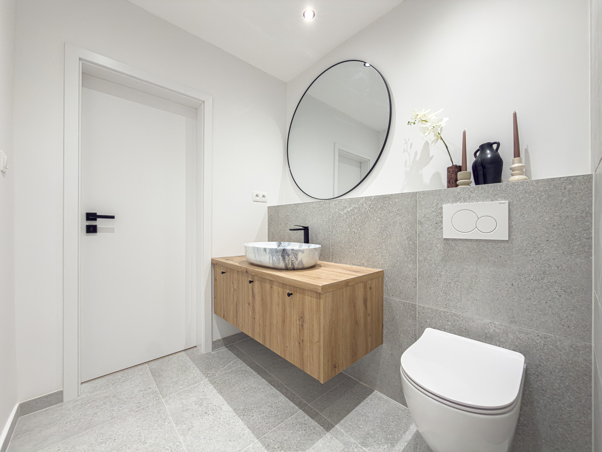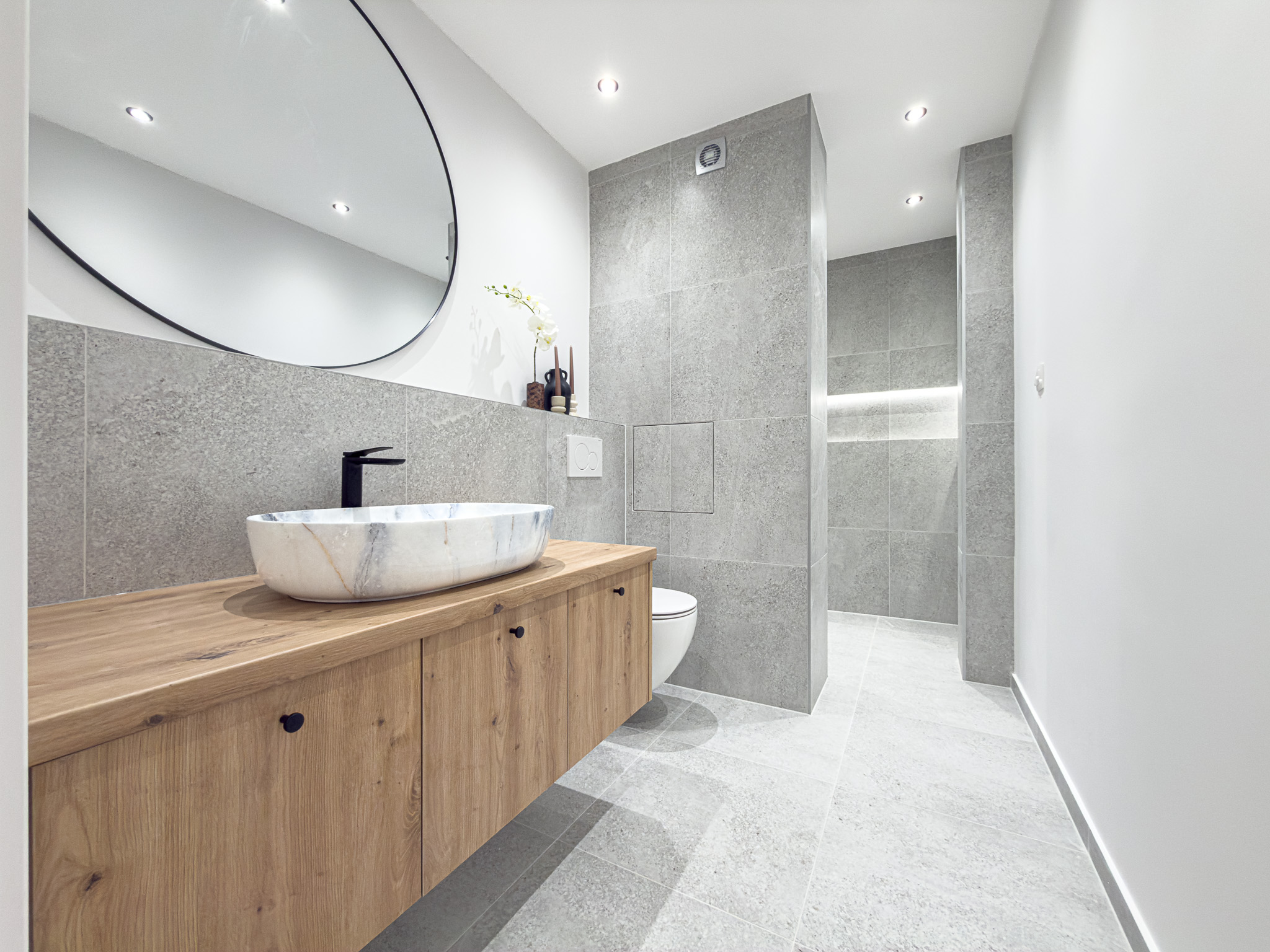 Kúpeľňa je riešená moderne a prakticky, nachádza sa v nej veľký priestranný sprchový kút a skrinka pod umývadlom, ktorá ponúka ďalší úložný priestor.