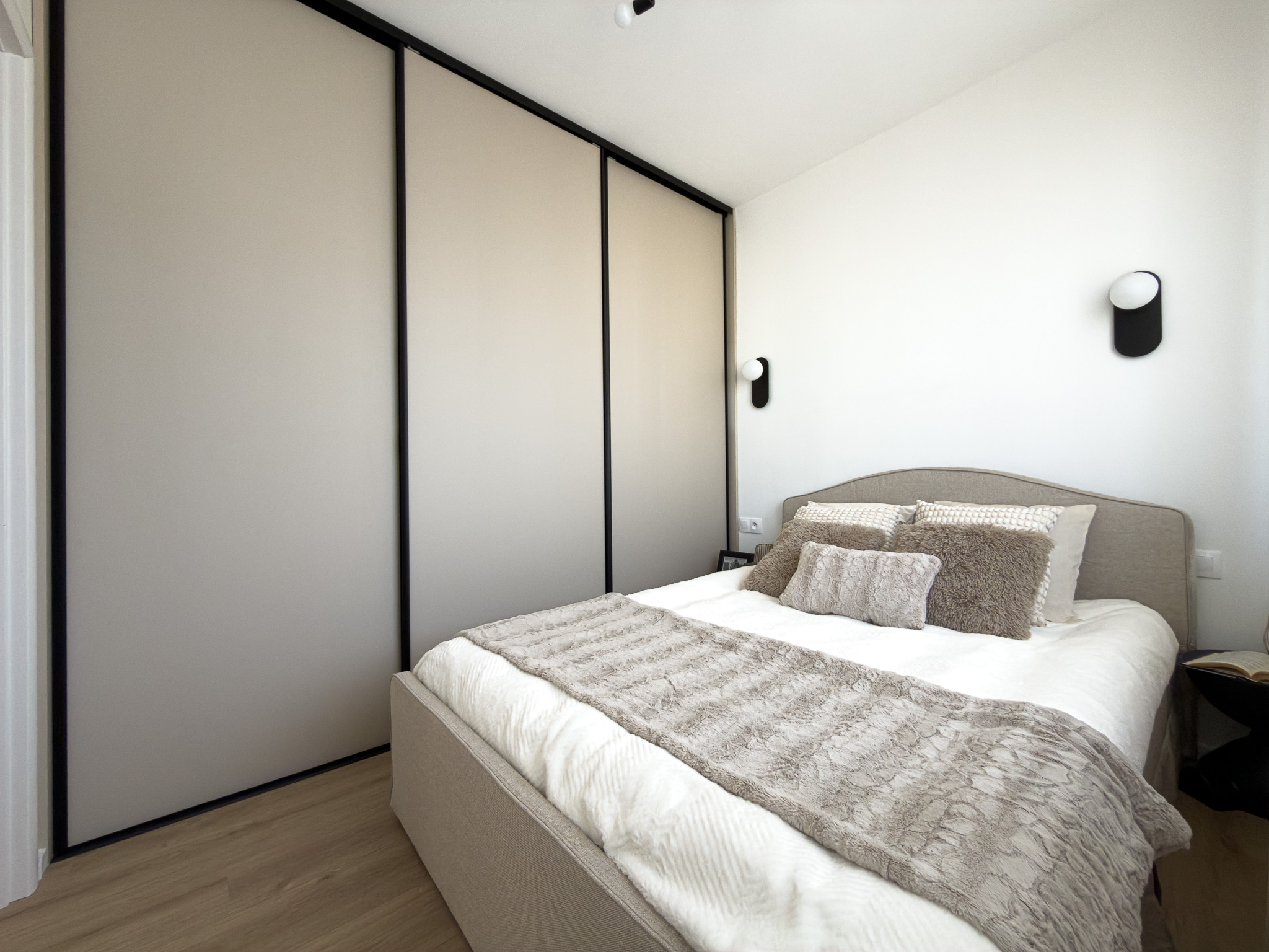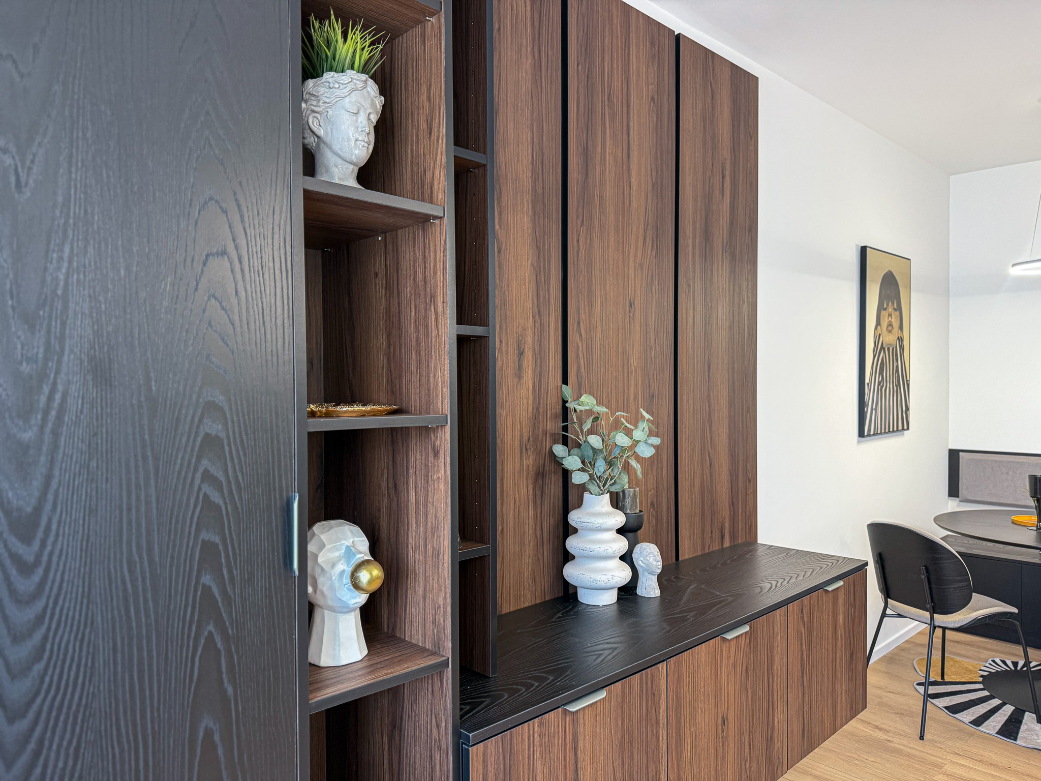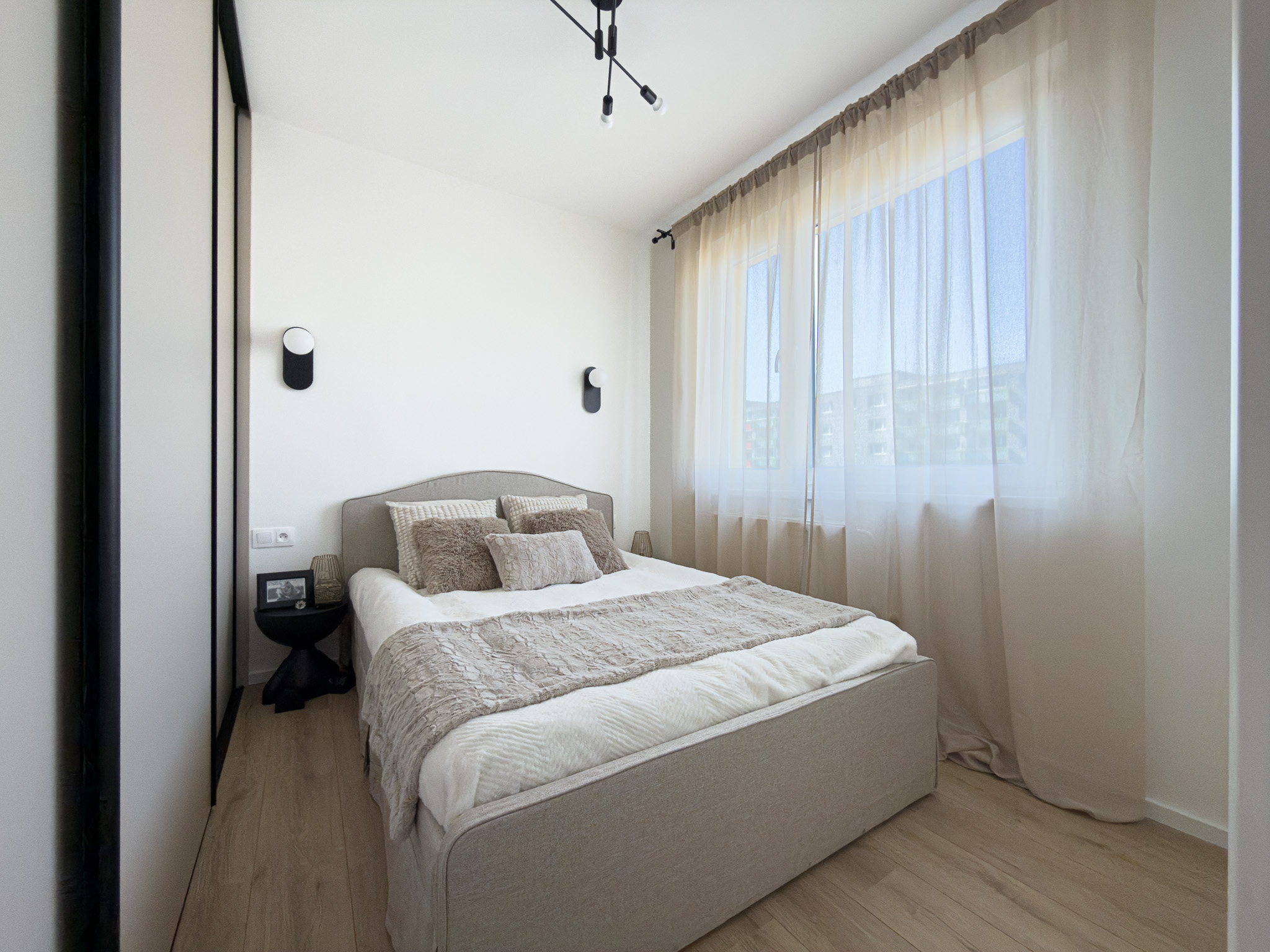 Dispozične byt pozostáva zo vstupnej chodby so šatníkovou skriňou, odkiaľ sa vchádza do obývacej a kuchynskej časti, kúpeľne a WC. Kuchynská linka je vybavená všetkými spotrebičmi - umývačka riadu, chladnička, teplovzdušná rúra, mikrovlnná rúra, elektrická sklokeramická varná doska a digestor. Obývacia izba poskytuje ďalší úložný priestor, ako aj knižnicu, skrinku pod TV či jedálenský kút. V prípade záujmu bude zabezpečený nový televízor. Z izby sa vchádza na loggiu. V spálni je manželská posteľ a priestranná roldor skriňa. Kúpeľňa je vybavená vaňou, umývadlom a práčkou.Všetok nábytok v byte je vyrobený na mieru a v jednotlivých miestnostiach je materiálovo, ako aj štýlovo prepojený, pričom ponúka maximálne množstvo úložného priestoru.